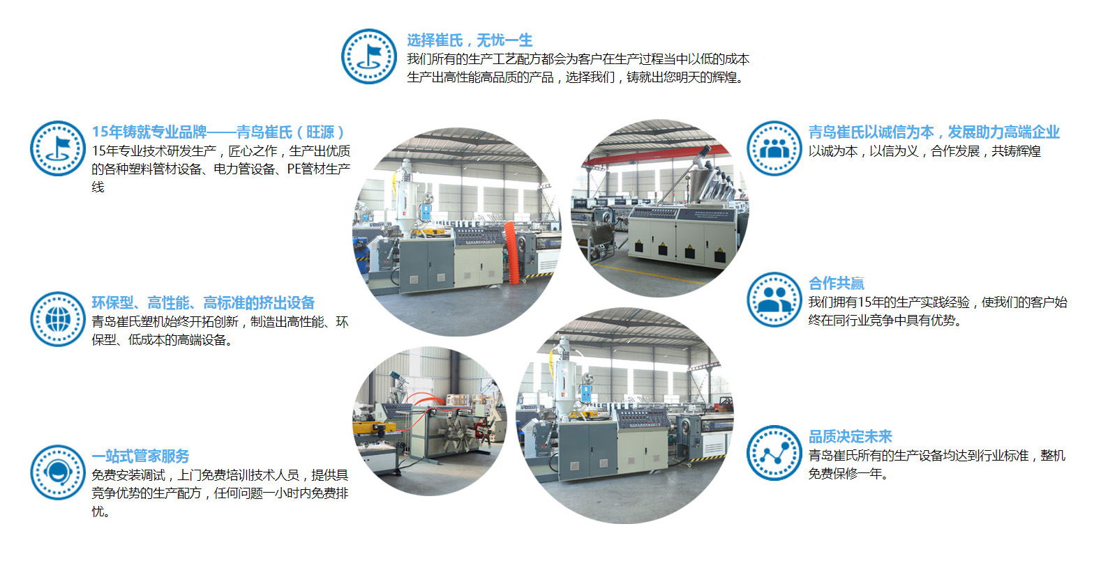 青島崔氏塑料機械有限公司始終以開拓創(chuàng)新的精神,緊跟世界塑機行業(yè)的發(fā)展趨勢,專注研發(fā)與生產(chǎn)預(yù)應(yīng)力波紋管全線設(shè)備,公司已有20多年的生產(chǎn)與實踐經(jīng)驗,在市場大環(huán)境下,緊跟國家發(fā)展趨勢,使我們的客戶在市場競爭中有一席之地,人生就是不斷決定的過程、決定沒有對與錯,只有得與失!選擇崔氏我們定不負卿。